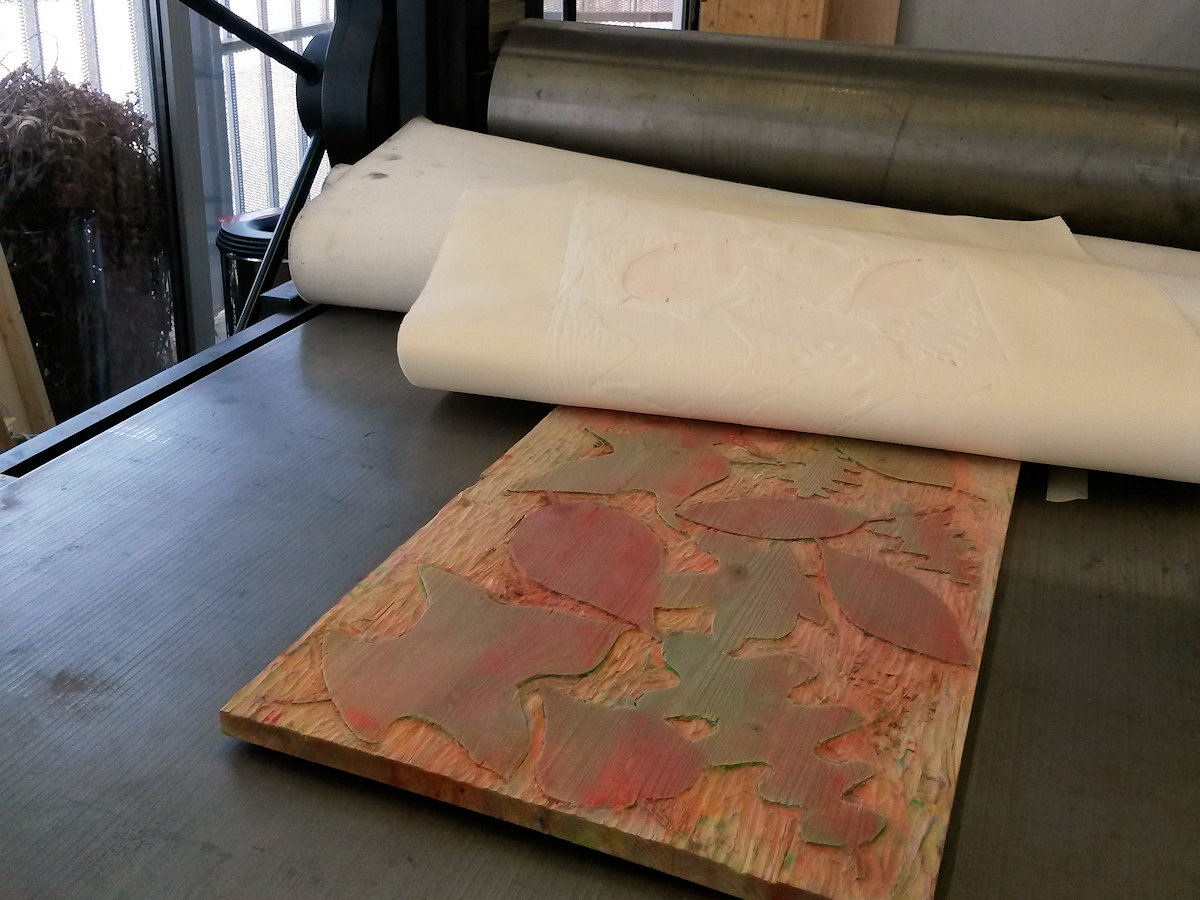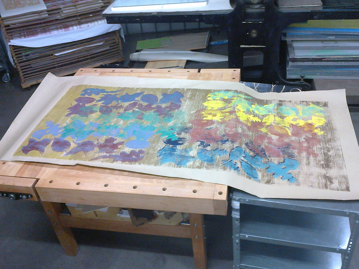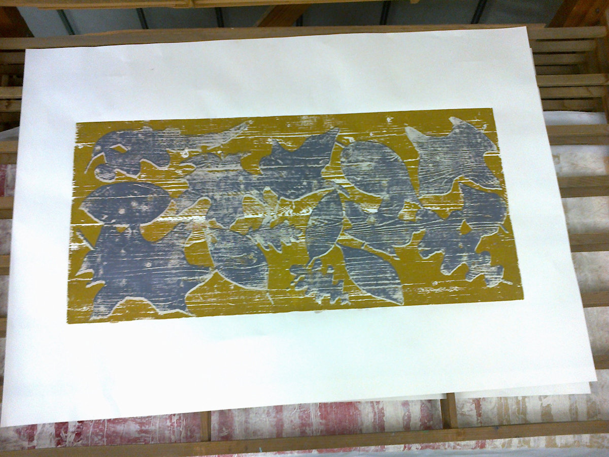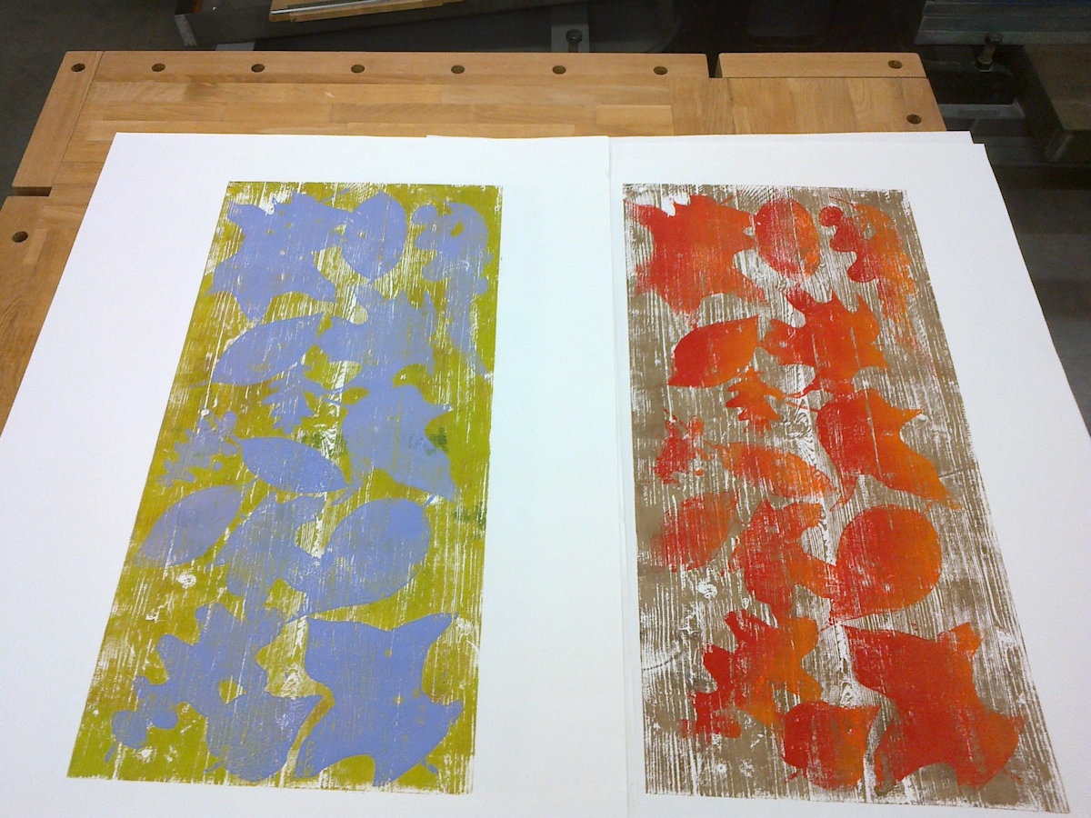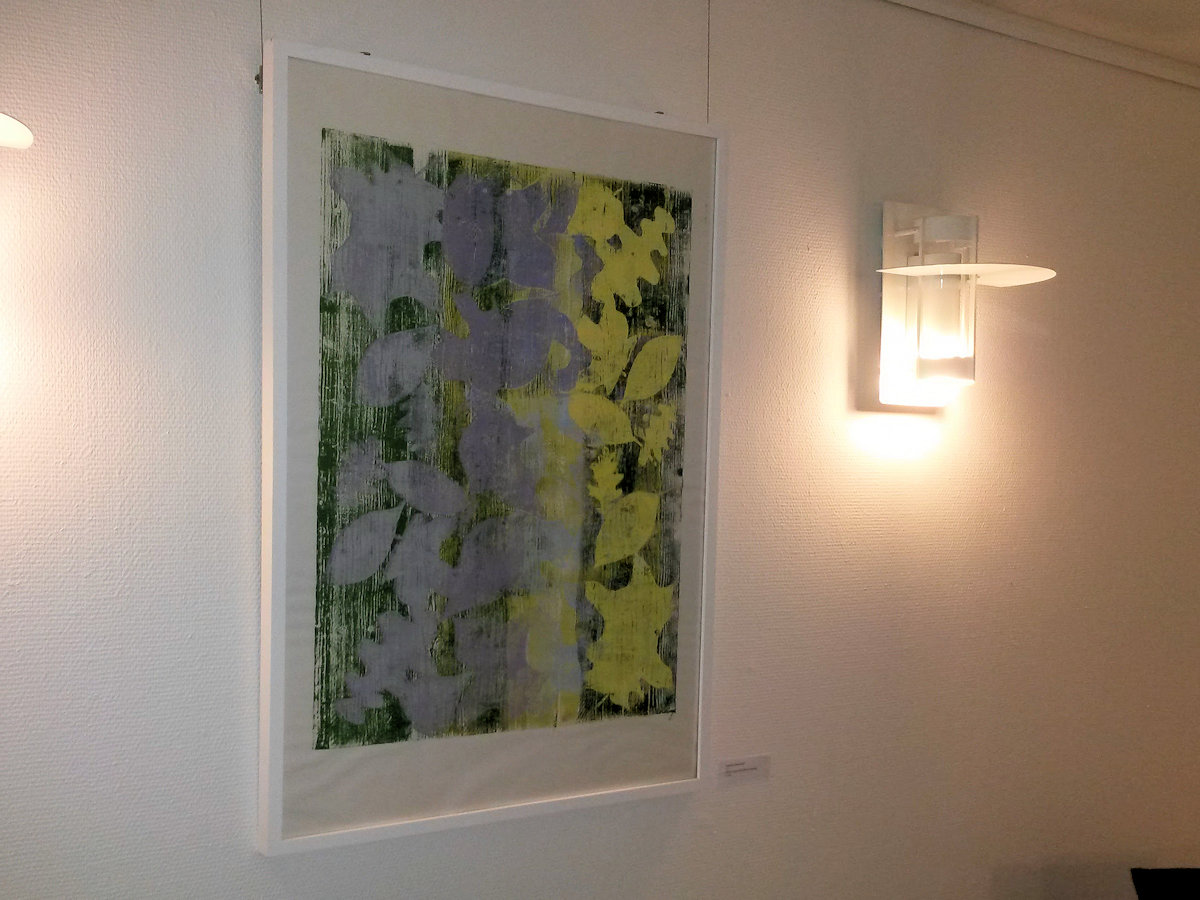 Wald ist ein Holzschnitt und ein Materialdruck mit zwei Druckplatten, die mehrfach übereinander gedruckt wurden. Ein Blatt dieser Reihe konnte bei der Jahreausstellung der Kunschule im Rathaus in Korb ausgestellt werden.