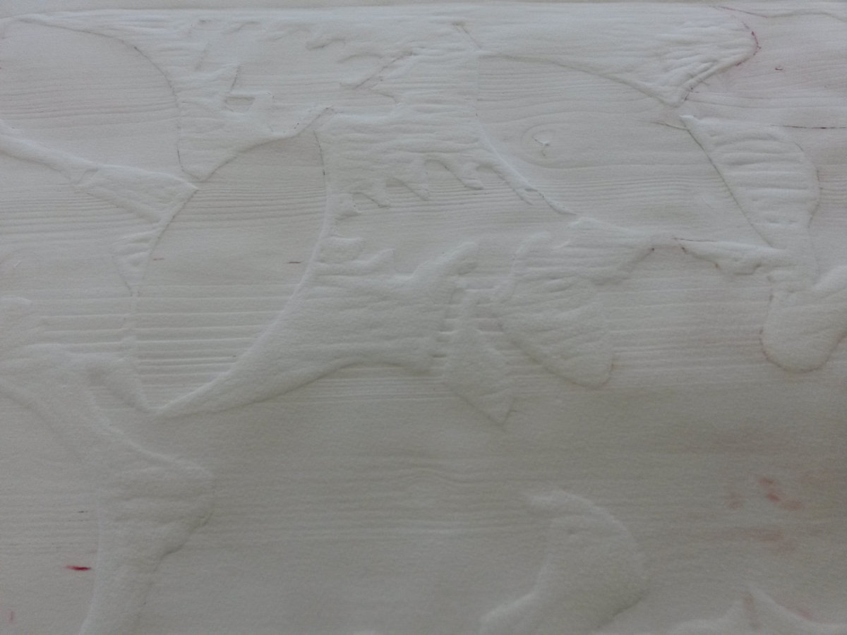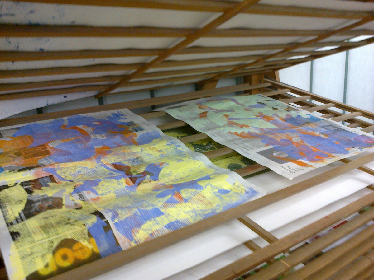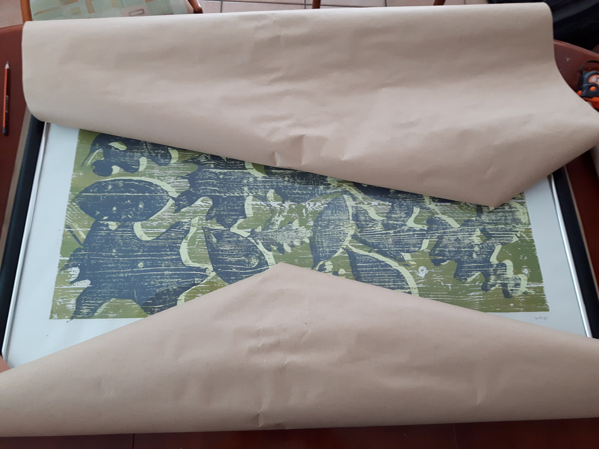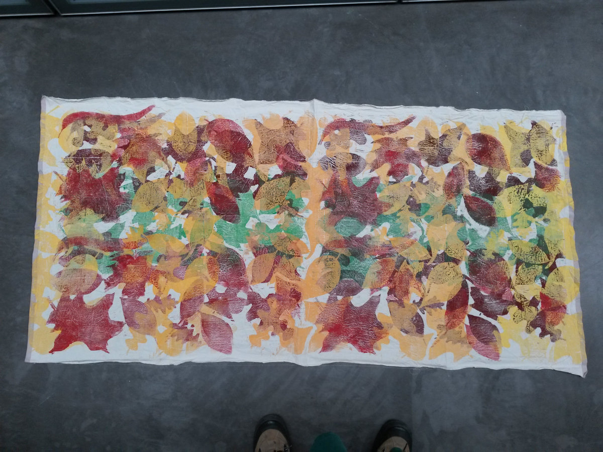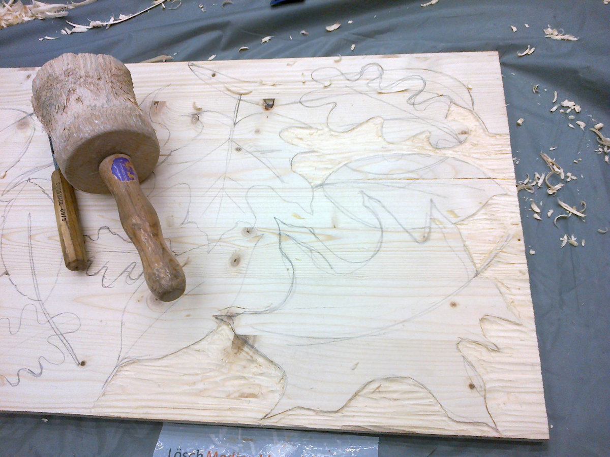 Wald ist ein Holzschnitt und ein Materialdruck mit zwei Druckplatten, die mehrfach übereinander gedruckt wurden. Ein Blatt dieser Reihe konnte bei der Jahreausstellung der Kunschule im Rathaus in Korb ausgestellt werden.