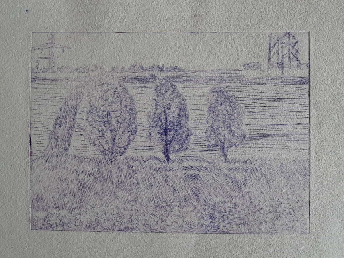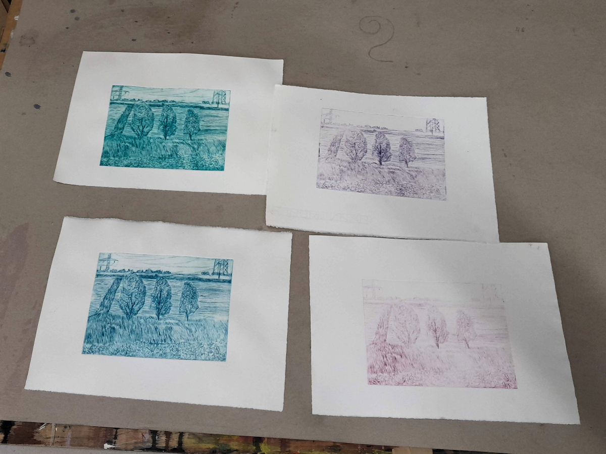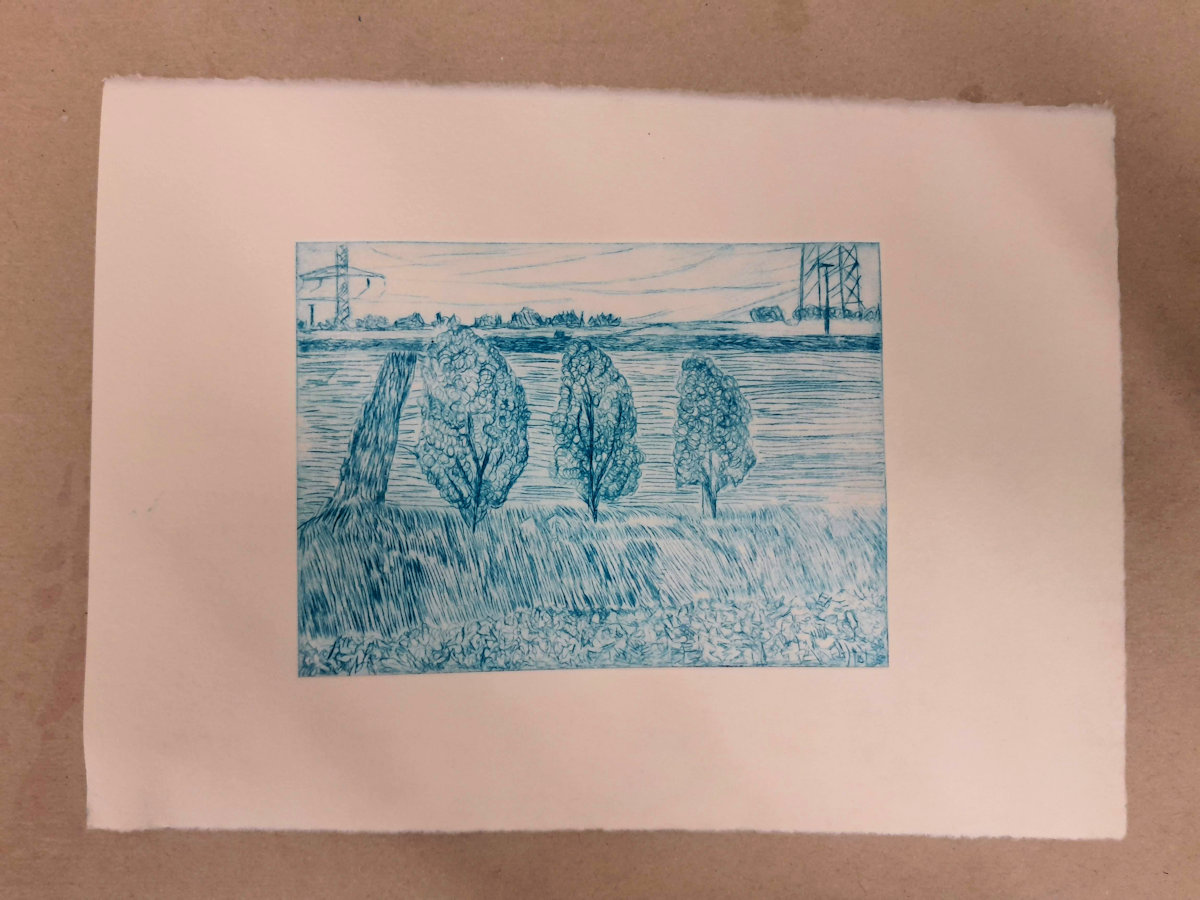 Drei Bäume ist ein Motiv, dass ich als Linolschnitt, als Radierung und als Holzschnitt jeweils im gleichen Maßsstab abgebildet habe.